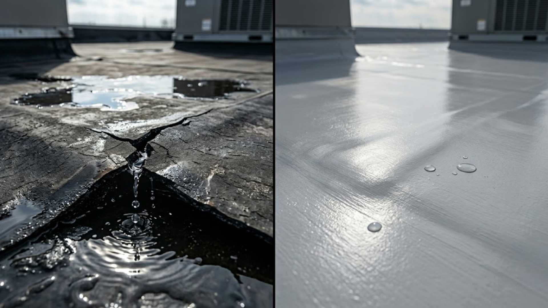 Best EPDM roof leak solutions showing before and after repair with waterproof liquid rubber coating